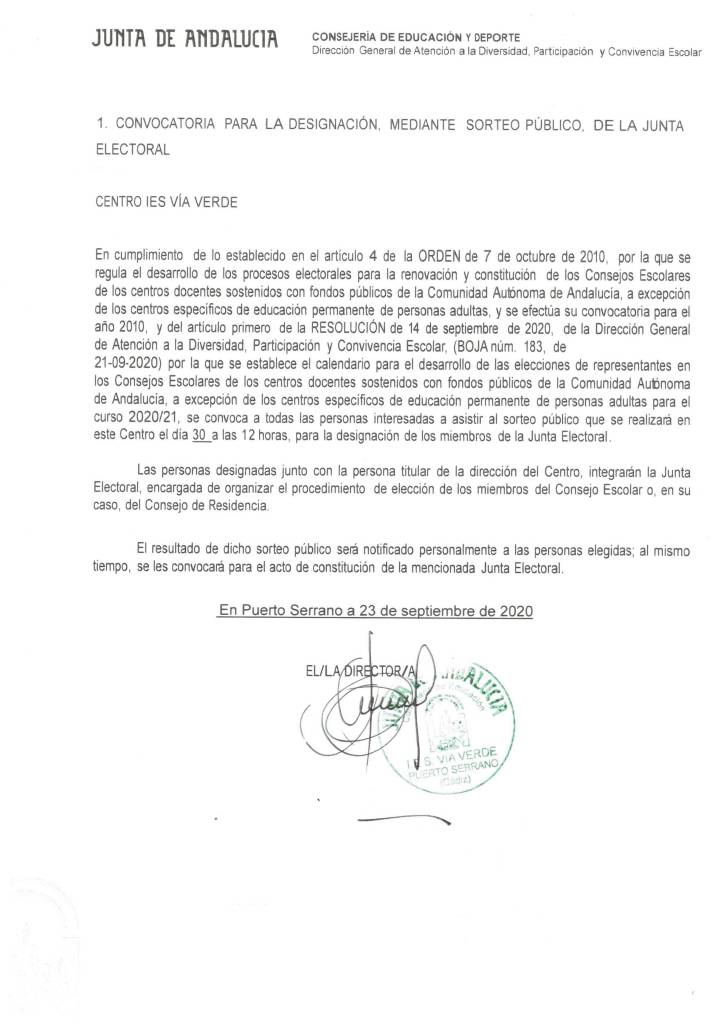 Inicio » Sin categoría » CONVOCATORIA PARA DESIGNACIÓN, MEDIANTE SORTEO PÚBLICO, DE LA JUNTA ELECTORAL PARA LA RENOVACIÓN DEL CONSEJO ESCOLAR DEL I.E.S. VÍA VERDE