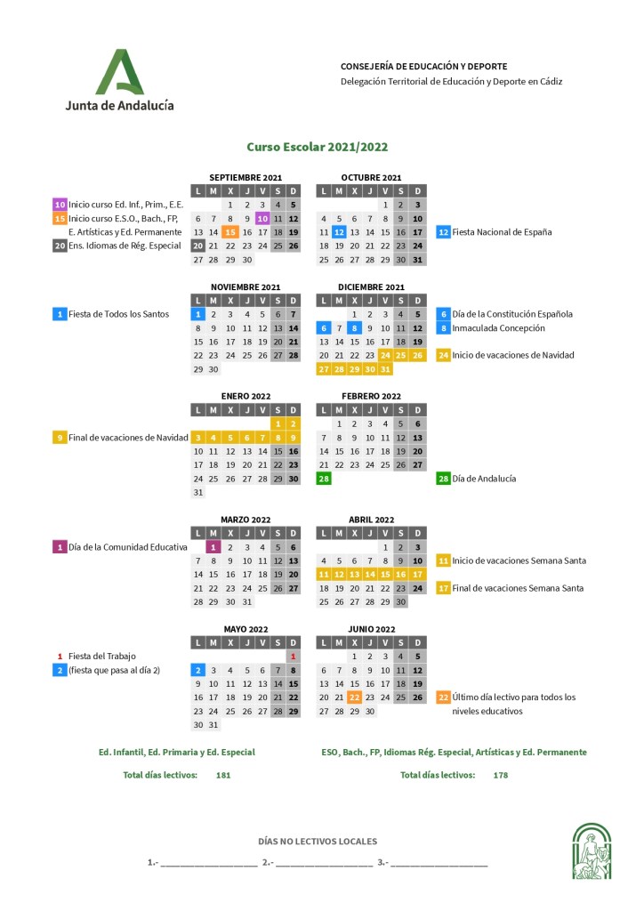 - El calendario escolar es el establecido para toda la comunidad educativa de Cádiz, además de los días 11 de octubre y 7 de diciembre, fijados por el Consejo Escolar Municipal.